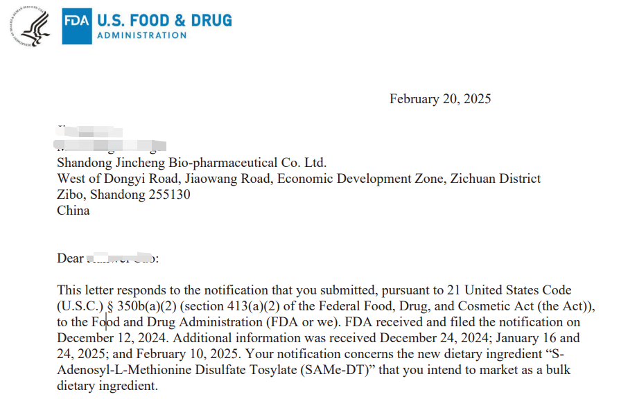 ? ? ? ? 日前,經過兩個多月的嚴格審核,金城醫藥集團子公司山東金城生物藥業有限公司(簡稱金城生物)自主研發的S-腺苷-L-蛋氨酸對甲苯磺酸硫酸鹽(SAMe-DT)順利通過美國食品藥品監督管理局(FDA)新膳食成分(NDI)認證,FDA正式允許金城生物SAMe作為新膳食營養成分在美國合規銷售,金城生物成為國內首家獲此認證的原料生產企業,也是國內生物科技企業在全球功能性成分領域取得的又一重大突破,同時標志著金城生物的科研實力與國際合規能力獲得國際權威認可。