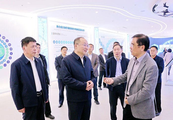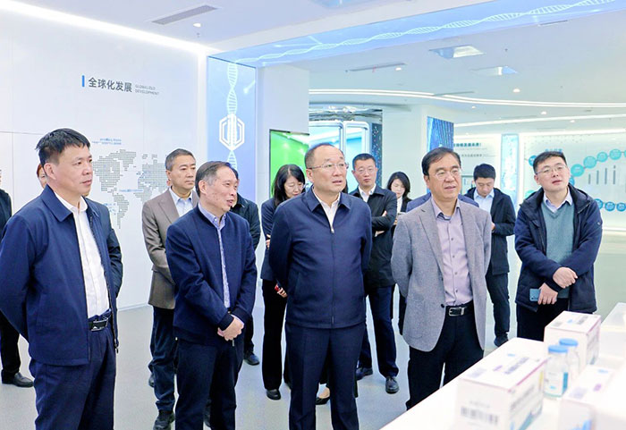 在“金城合成生物學(xué)智創(chuàng)空間”科技展廳,李濤詳細了解了金城合成生物學(xué)、醫(yī)藥健康產(chǎn)業(yè)及企業(yè)發(fā)展情況。集團董事長趙葉青介紹了金城醫(yī)藥產(chǎn)業(yè)布局及合成生物學(xué)等產(chǎn)業(yè)板塊發(fā)展現(xiàn)狀。